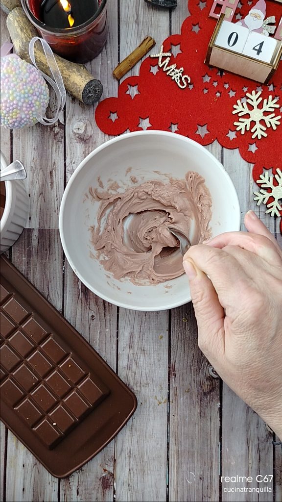 Pasado este tiempo, derrite también el chocolate negro, siempre durante 90 segundos en varias etapas teniendo cuidado durante esta operación. Mezcla el chocolate durante un minuto con una cucharita.