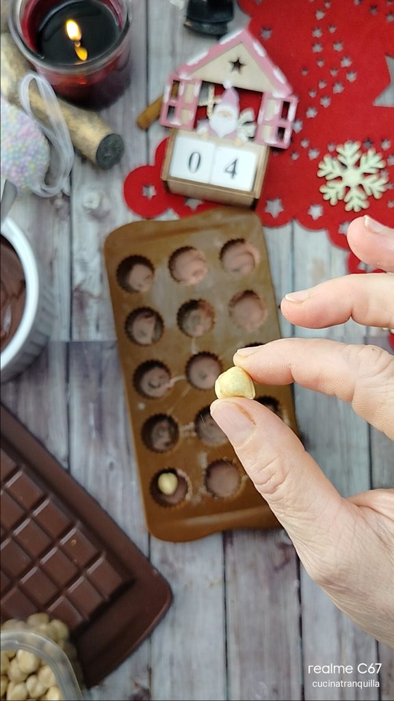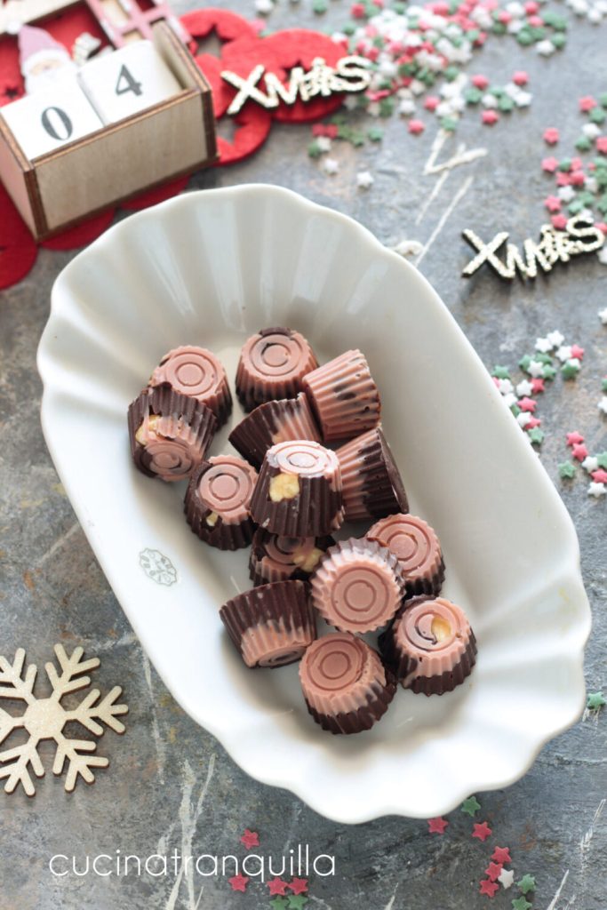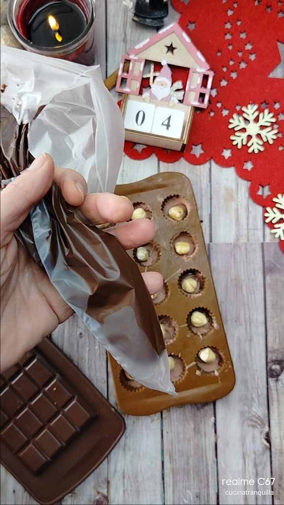 Bombones de Navidad con chocolate Rubí y chocolate negro, y corazón de avellanas tostadas, tres ingredientes para una idea de regalo fácil y deliciosa. Para hacerlos se requieren muy pocos pasos, especialmente si tienes un microondas, que es la herramienta que utilicé yo, pero es posible derretir el chocolate en cacerolas diferentes y bien limpias, tened cuidado, al baño maría. El resultado final será el mismo, solo que con tiempos ligeramente más largos. Sin embargo, derretir el chocolate en el microondas también requiere atención. De hecho, en los pasos fotográficos te recomiendo derretir el chocolate en varias etapas. Esto ayudará a que el chocolate no se queme en esta fase. En cuanto a los moldes, si no tienes mucha destreza o habilidad con el manejo del chocolate, te indico usar los de silicona, más fáciles de manejar en la fase de presentación del bombón. Aquí abajo te dejo algunas ideas de regalo navideñas, mientras que después de la receta respondo a las preguntas más comunes.