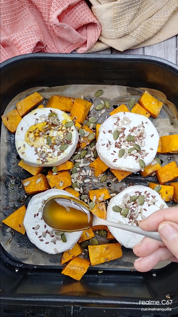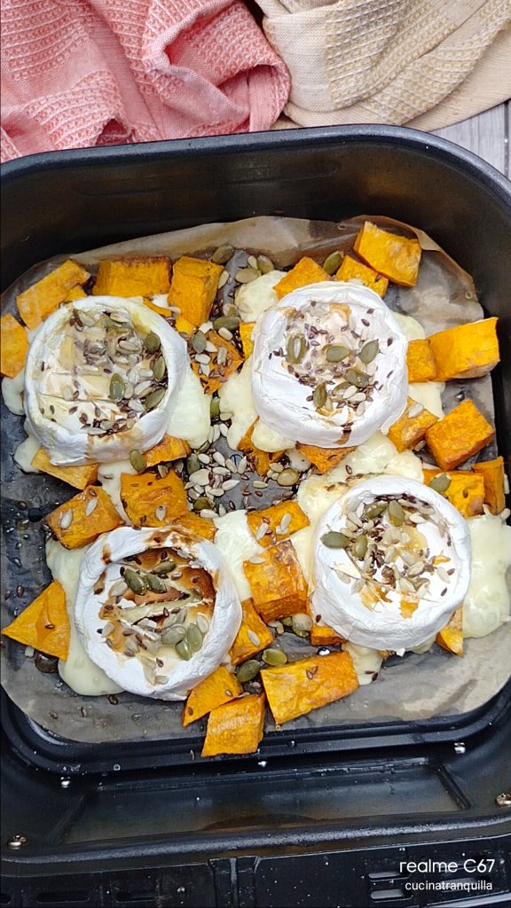 Brie y calabaza en freidora de aire, una receta particular y buenísima perfecta como aperitivo pero ideal también como segundo plato completo. Una receta otoñal simple, rápida y deliciosísima. Para esta idea he utilizado algunas rodajas de calabaza butternut y mini brie sin lactosa, pero vosotros podéis usar los mismos ingredientes en la versión que prefiráis, prestando atención a los tiempos de cocción. Obviamente esta receta se puede replicar tranquilamente en el horno tradicional y, si sois expertos, también en el microondas, con las debidas precauciones sobre los instrumentos e ingredientes a utilizar. Aquí abajo os dejo otras ideas para cocinar la calabaza de manera diferente y, al final de la receta completa con todos los pasos fotográficos, encontraréis también las respuestas a las preguntas más comunes sobre esta receta