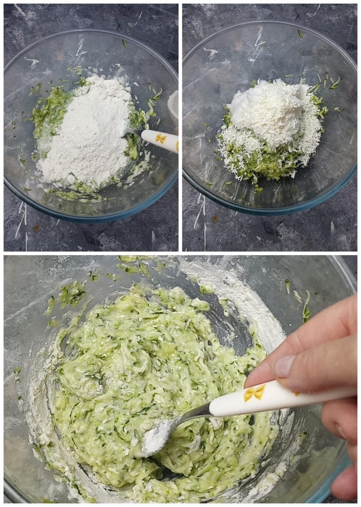 Añadimos la ricota salada rallada y la harina y seguimos mezclando los ingredientes delicadamente. Para esta operación basta simplemente un tenedor.