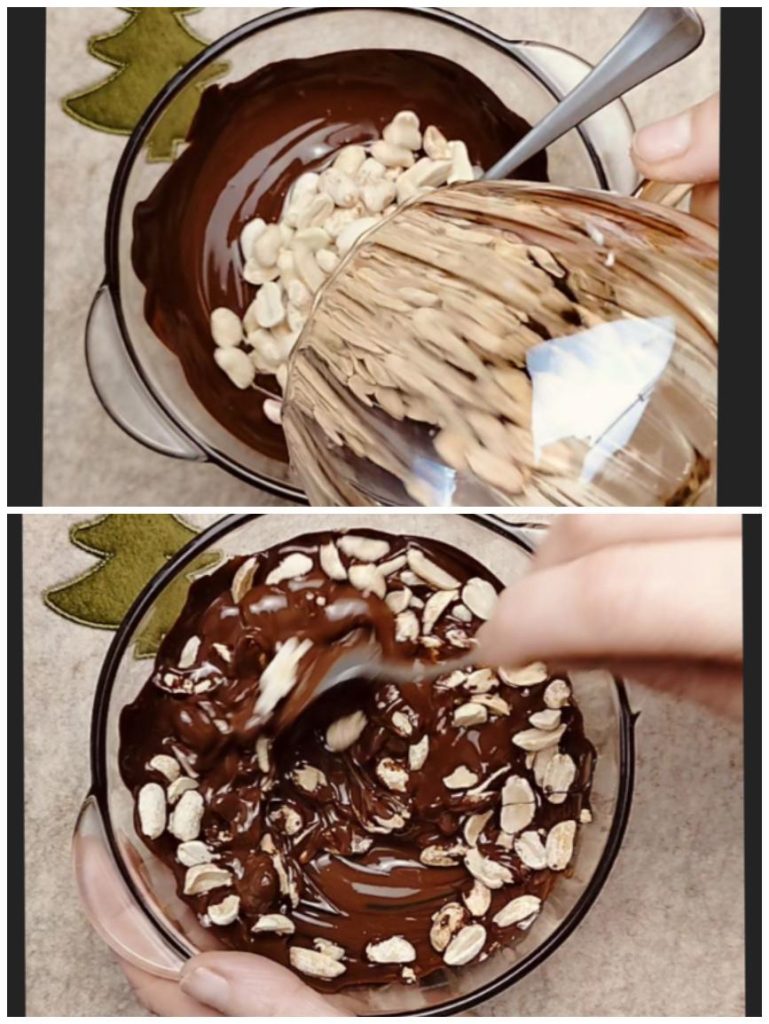 Añade los cacahuetes sumergiéndolos todos juntos y mézclalos para obtener una mezcla homogénea.