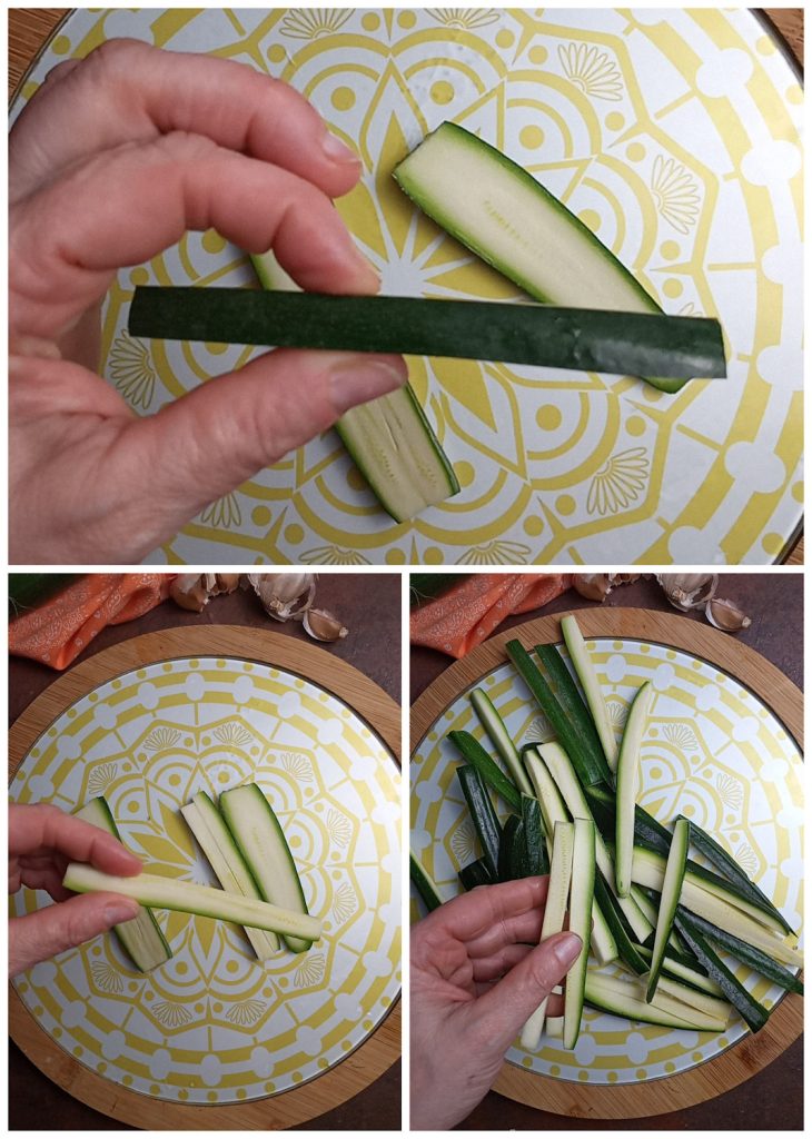 Mi consejo para una buena cocción de los calabacines está en el corte y en poner solo dos cucharadas de agua en el fondo del plato crisp del microondas para una rápida precocción antes de proceder con el condimento final.