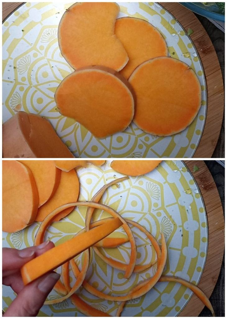 De la calabaza Butternut saca rebanadas y elimina la piel.