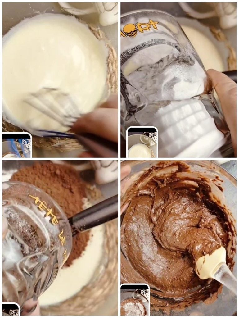 Añadimos los ingredientes secos, harina, cacao y levadura, y continuamos mezclando bien para obtener una masa homogénea.