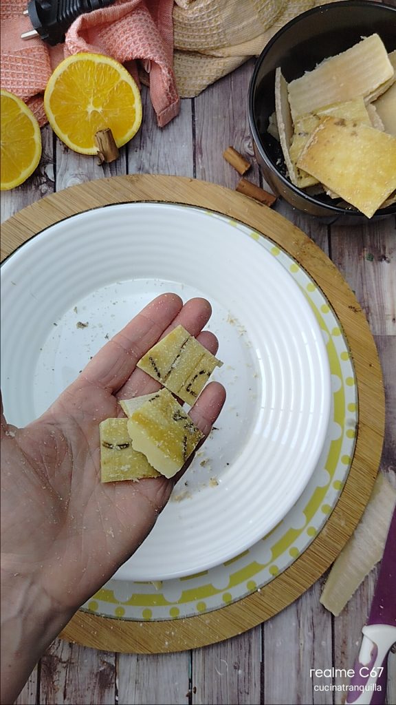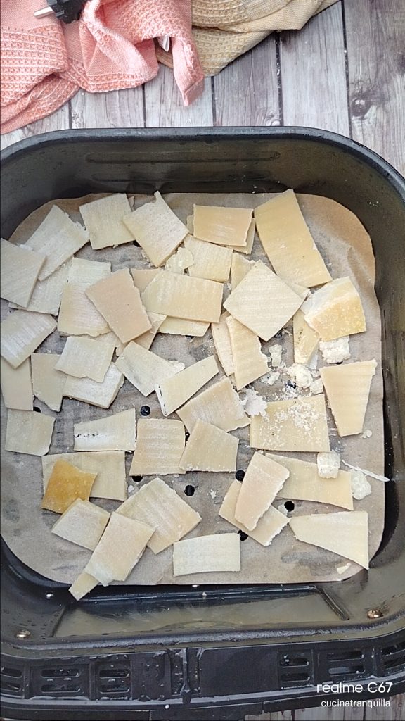Para hacer las Chips crujientes con cortezas de parmigiano en freidora de aire, lo primero que hay que hacer es limpiar muy bien las cortezas del queso y en realidad es la única operación que requiere unos minutos de tiempo y paciencia, ya que la cocción es realmente muy rápida en la freidora de aire.