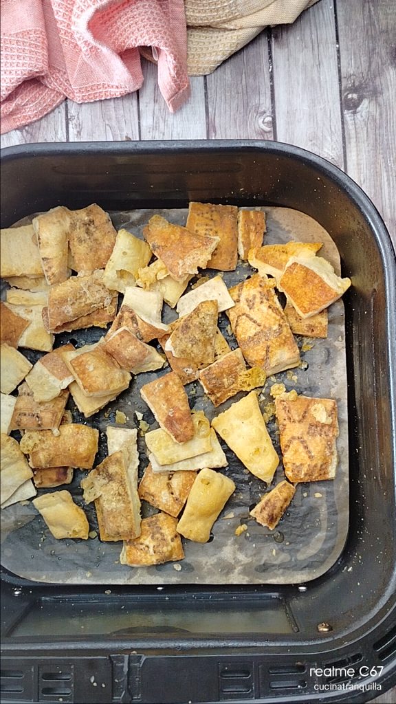 Distribuye las cortezas obtenidas en la cesta de la freidora de aire revestida con el papel de horno adecuado, procurando no superponerlas.