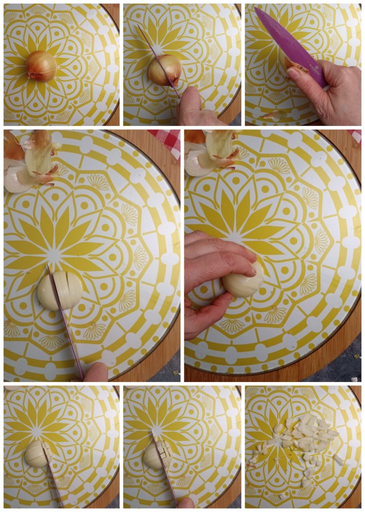 Pela la cebolla, córtala por la mitad y elimina la raíz y la parte superior.