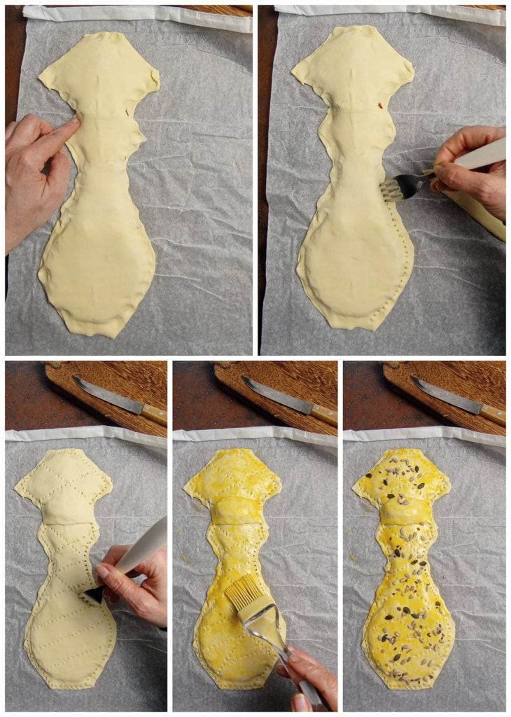 Haz pequeñas decoraciones con los dientes del tenedor y pinta la superficie con yema de huevo.