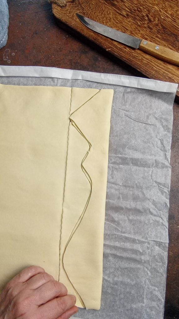 Puedes elegir si crear un pequeño patrón con papel de horno o papel de estraza para realizar la base y la parte superior de la corbata, o seguir mis indicaciones y trabajar directamente sobre el hojaldre.