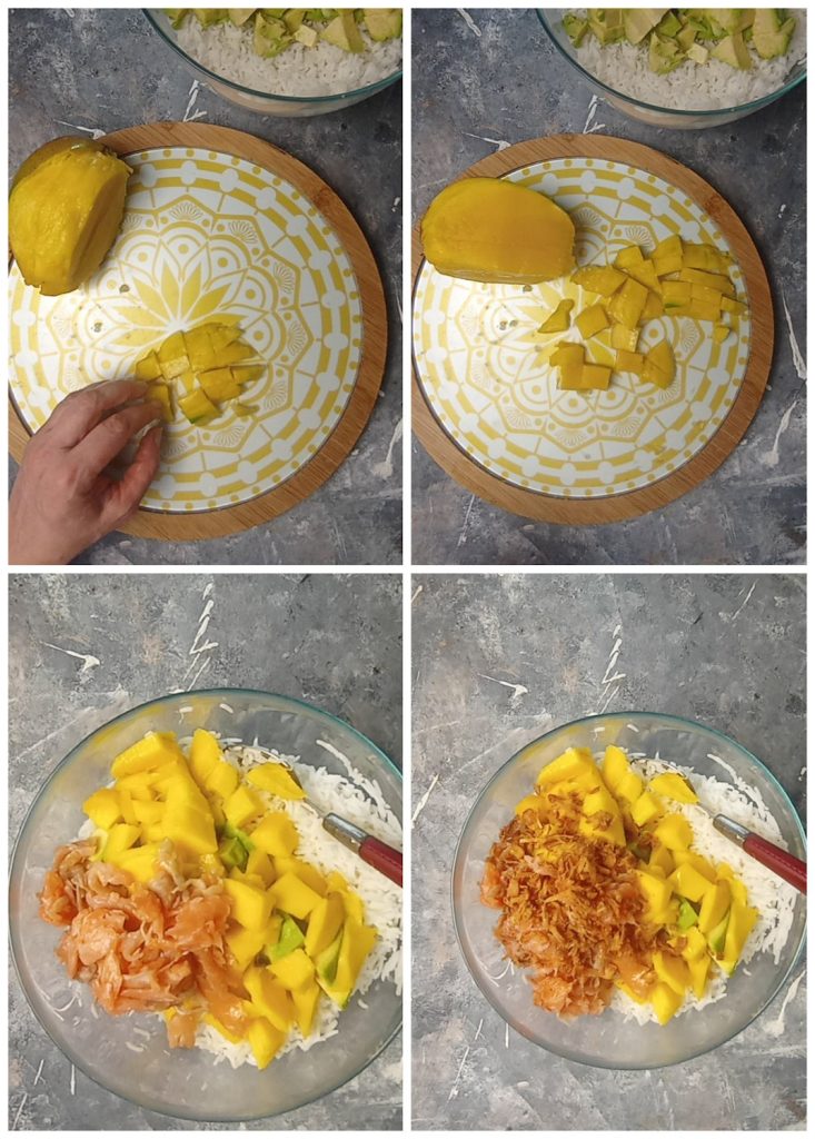 Ensalada de arroz basmati con mango y aguacate, fresca, fácil y rápida de hacer con solo cocinar el arroz.