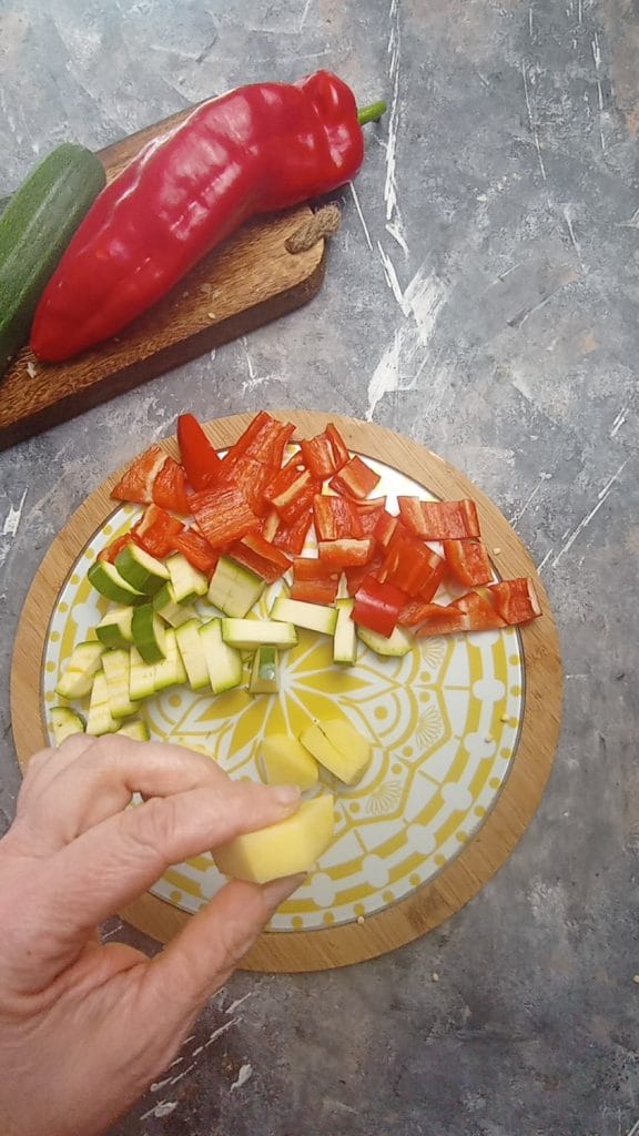 Corta todas las verduras en cubos no demasiado grandes, para obtener una cocción homogénea directamente con la feta.