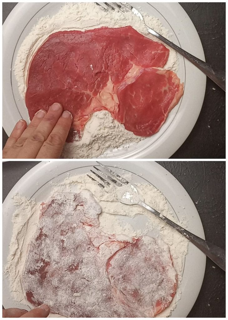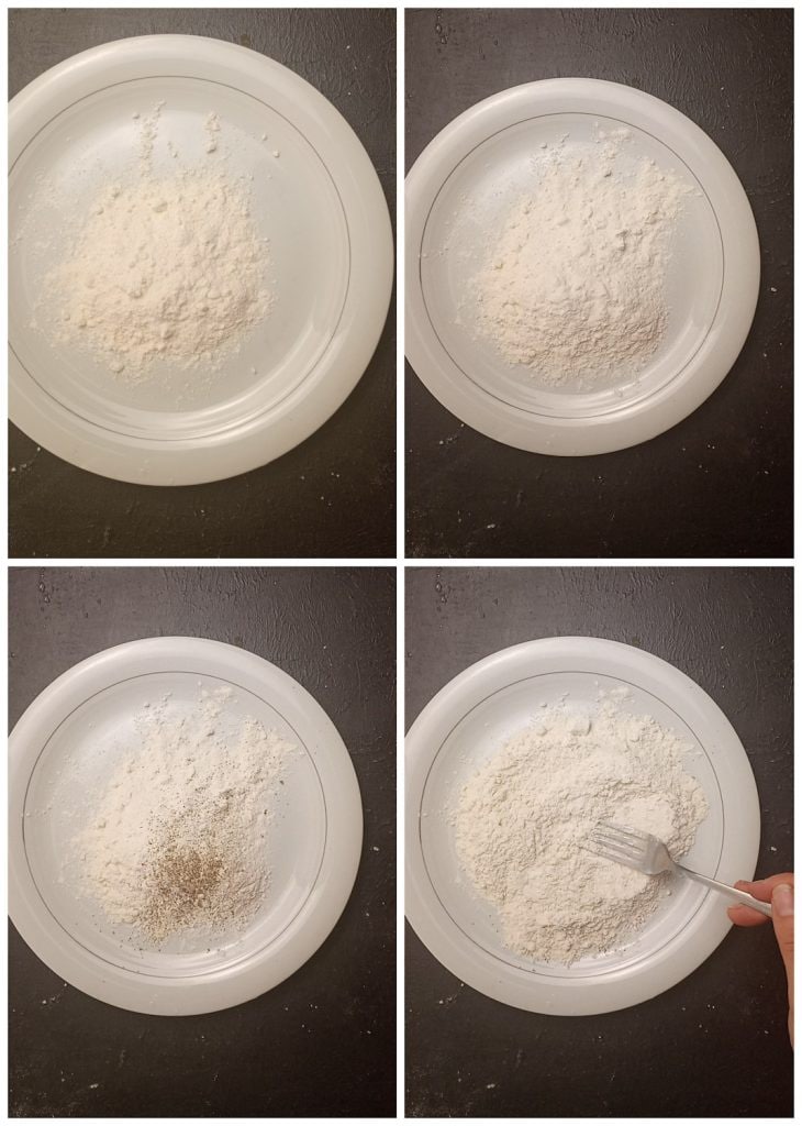 Para preparar los Filetes de ternera al vino blanco, lo primero que debes hacer es preparar en un plato la empanadura, mezclando la harina 00 con la pimienta y la sal.