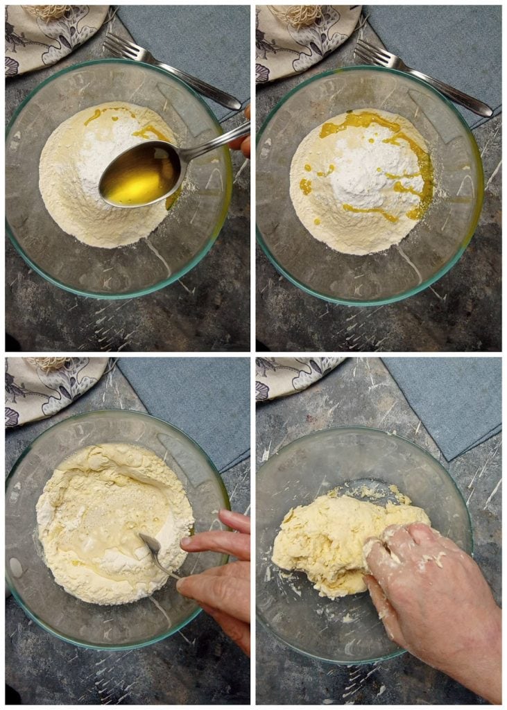 • Añade el aceite y comienza a mezclar con un tenedor, vertiendo el agua poco a poco.
