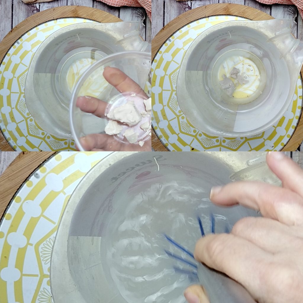 Para hacer la Focaccia con tomatitos y aceitunas de alta hidratación, disuelve la levadura en el agua tibia después de romperla ligeramente con la mano. Mezcla y espera unos minutos a que se forme la espuma en la superficie.