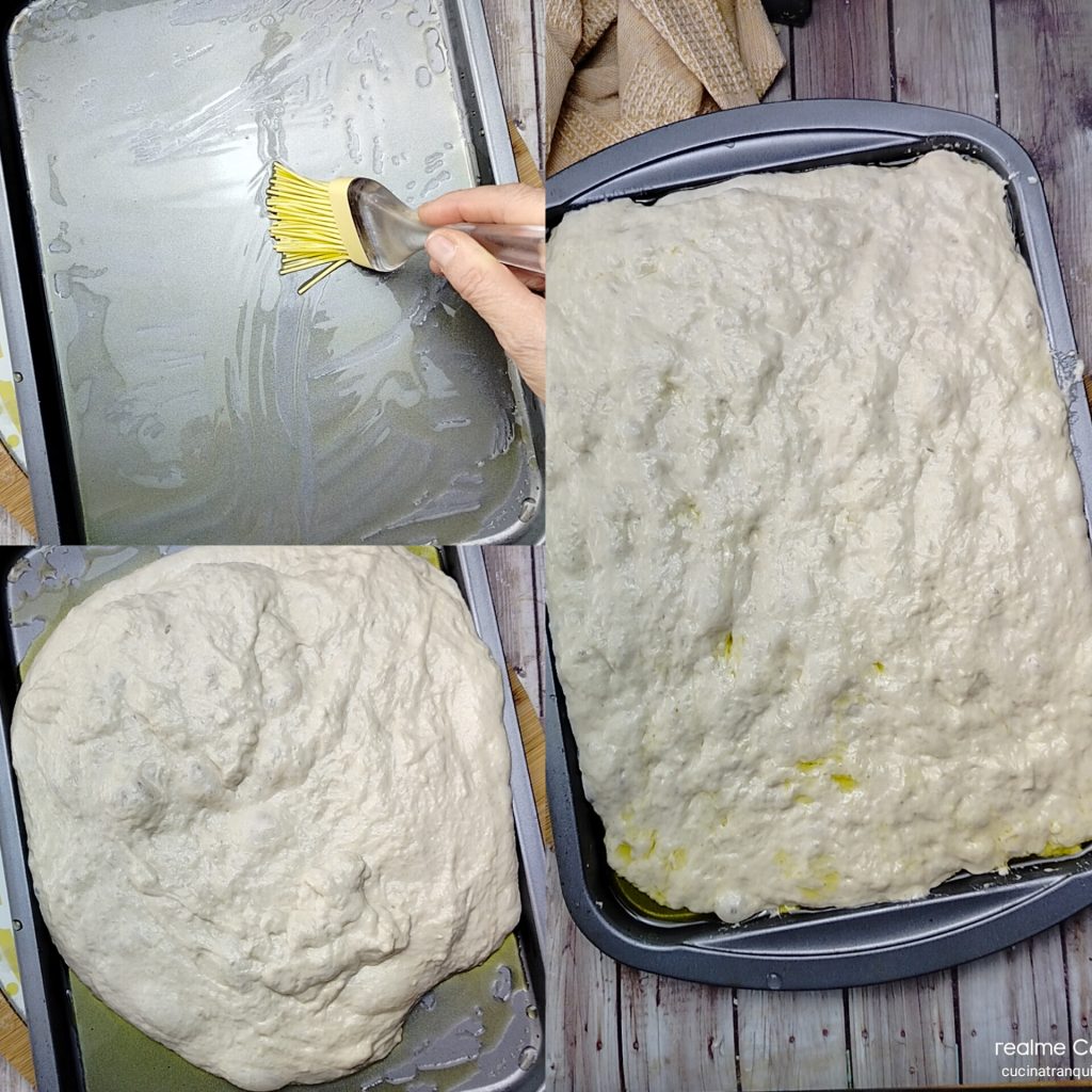 Deja reposar, siempre cubierto, y mientras tanto lava y corta los tomatitos y escurre y seca las aceitunas deshuesadas. Distribúyelos sobre la pizza, rocía la superficie con un poco más de aceite y hornea a 200° durante 30 minutos en horno precalentado ventilado.