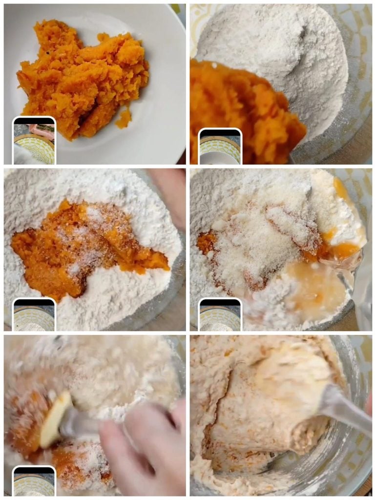 Después aplastémosla con un tenedor y unámosla, en un bol grande, a la harina, el queso rallado, la sal y el agua.