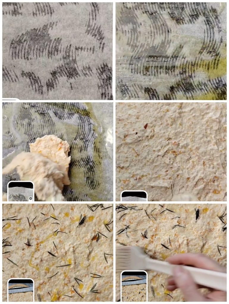 Engrasamos el papel de horno, extendemos la masa nivelándola y pincelamos con un poco más de aceite de oliva virgen extra.