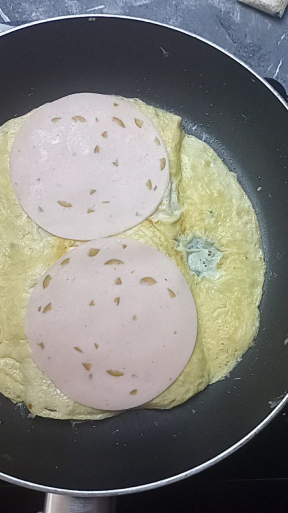 Colocamos dos rebanadas de pan de molde sobre la parte blanda del huevo y seguimos dejando que la tortilla se cuaje.