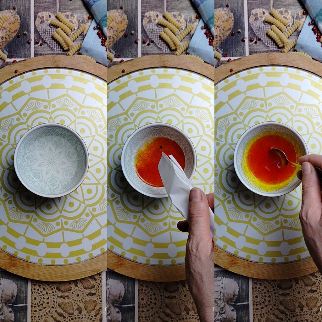 • Para hacer los Fusilli bucati con crema de ricotta y azafrán, primero en un cuenco pequeño con poca agua caliente disuelve un sobrecito de azafrán. Mezcla bien.