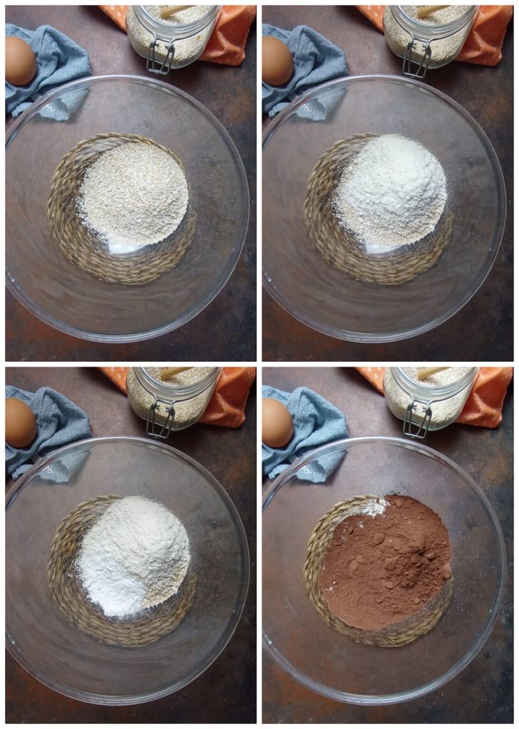 Para hacer las Galletas con salvado de avena y cacao, en un bol mezcla el salvado con la harina, la levadura y el cacao amargo en polvo.