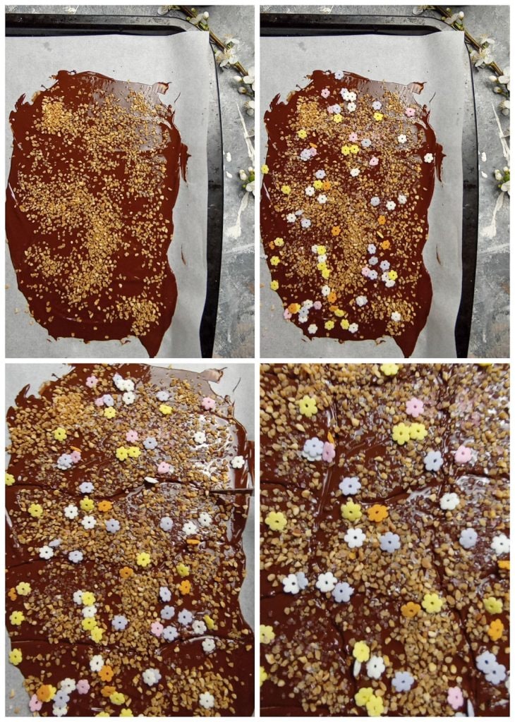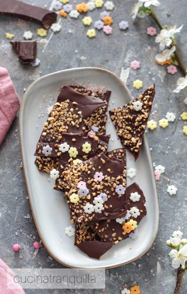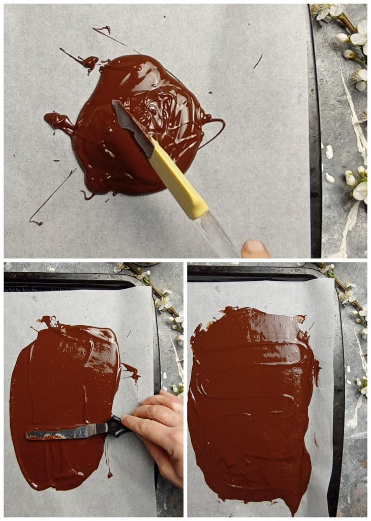 Perfecta también para aprovechar el chocolate de Pascua, para realizar esta idea no es necesario templar el chocolate, basta con tener papel de horno y una espátula de acero de las sencillas, para extender el chocolate.
