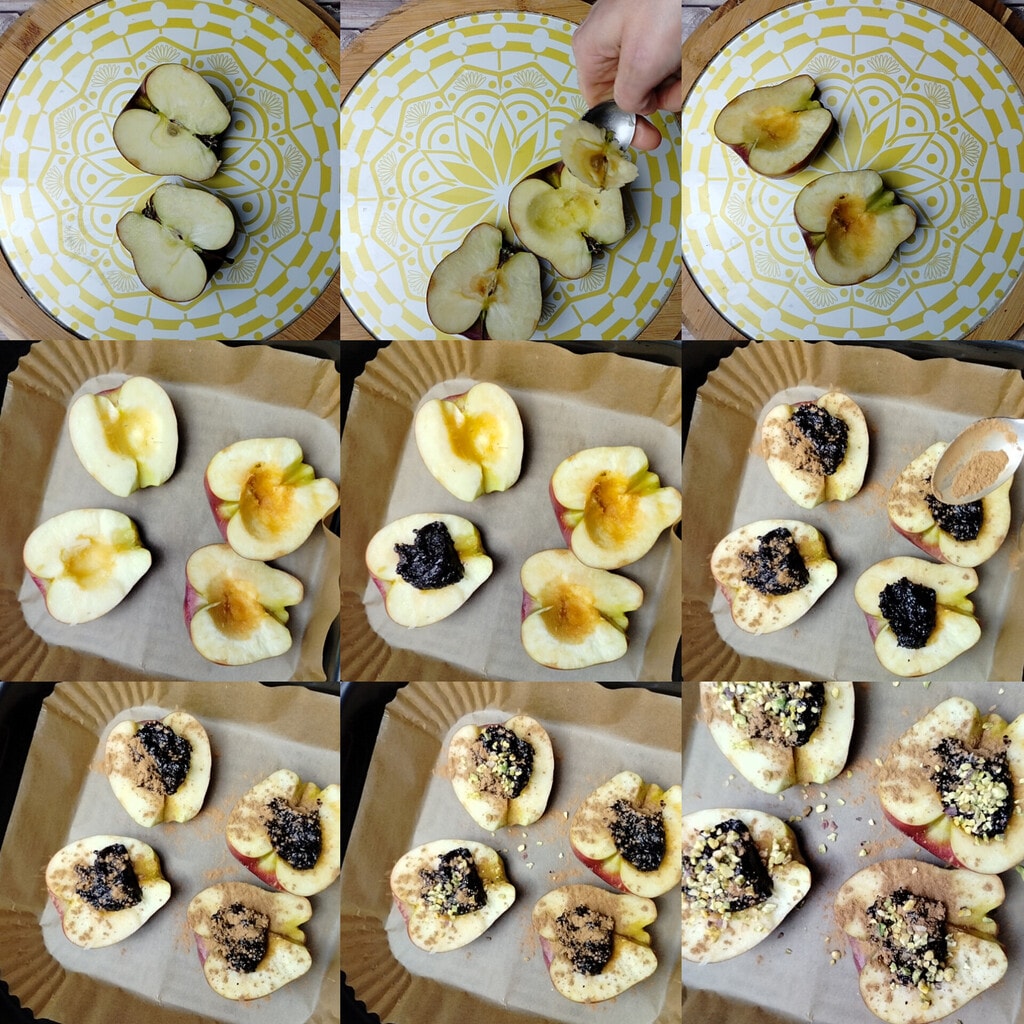 Para hacer las Manzanas cocidas con scrucchiata de uva en freidora de aire, primero lava bien las manzanas, elimina el pedúnculo y la parte del corazón y luego rellénalas con una buena cucharada de scrucchiata.