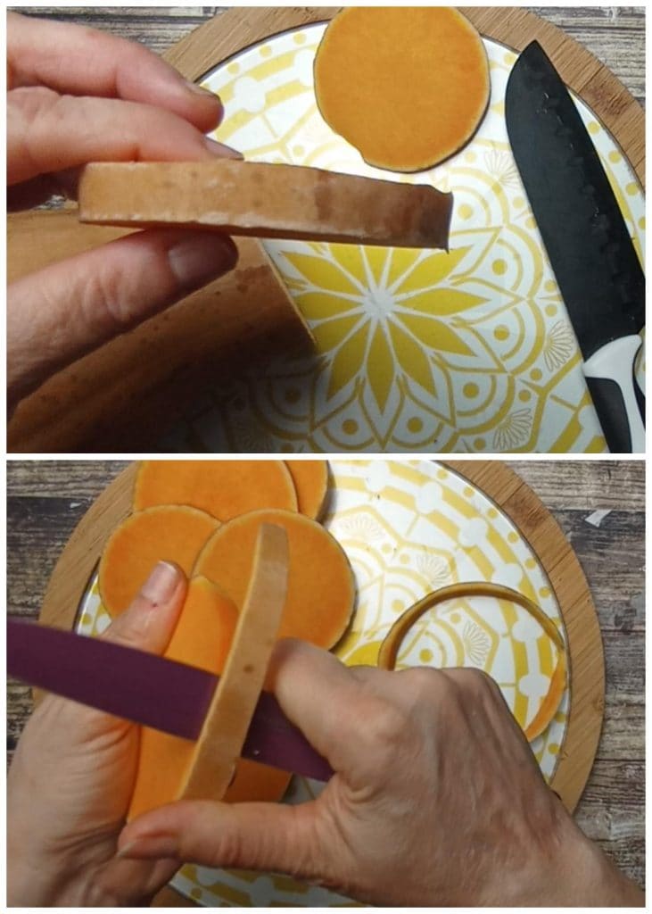 • Repite la operación para todas las rodajas de calabaza y colócalas en una bandeja con papel de horno.