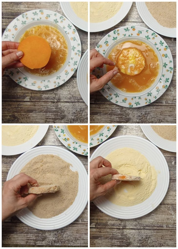 Milanesas de calabaza al horno, con sal aromatizado con setas porcini secas, deliciosas y crujientes por fuera con su empanado de harina de sémola de trigo duro, muy suaves en el corazón, tras una cocción en el horno tradicional.