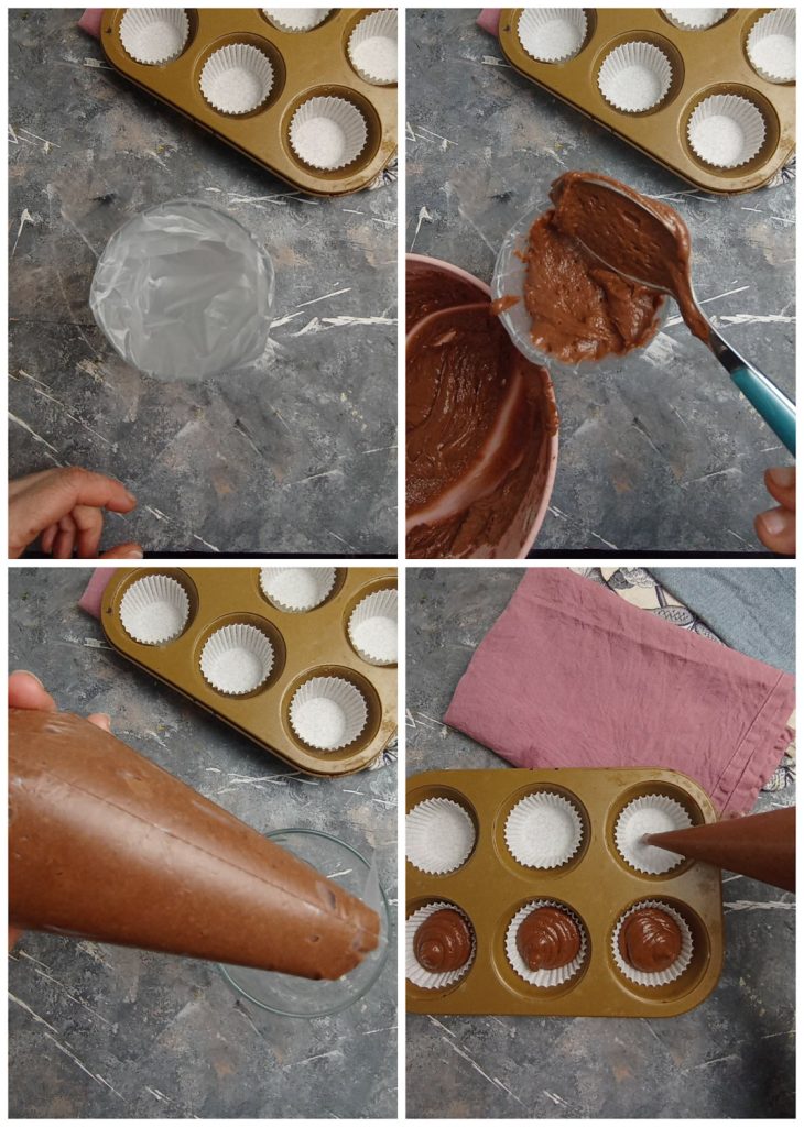 Una vez puesta, reviste el molde para muffins con cápsulas adecuadas y corta la punta de la manga pastelera.