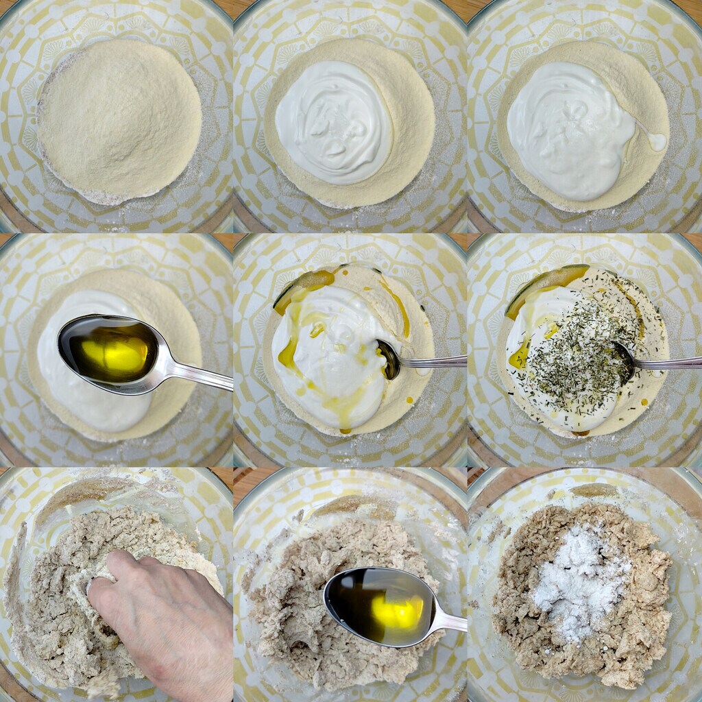 Mini tortitas de kéfir con harina integral y cebollino, fáciles de hacer, con masa en un bol, sin larga fermentación.