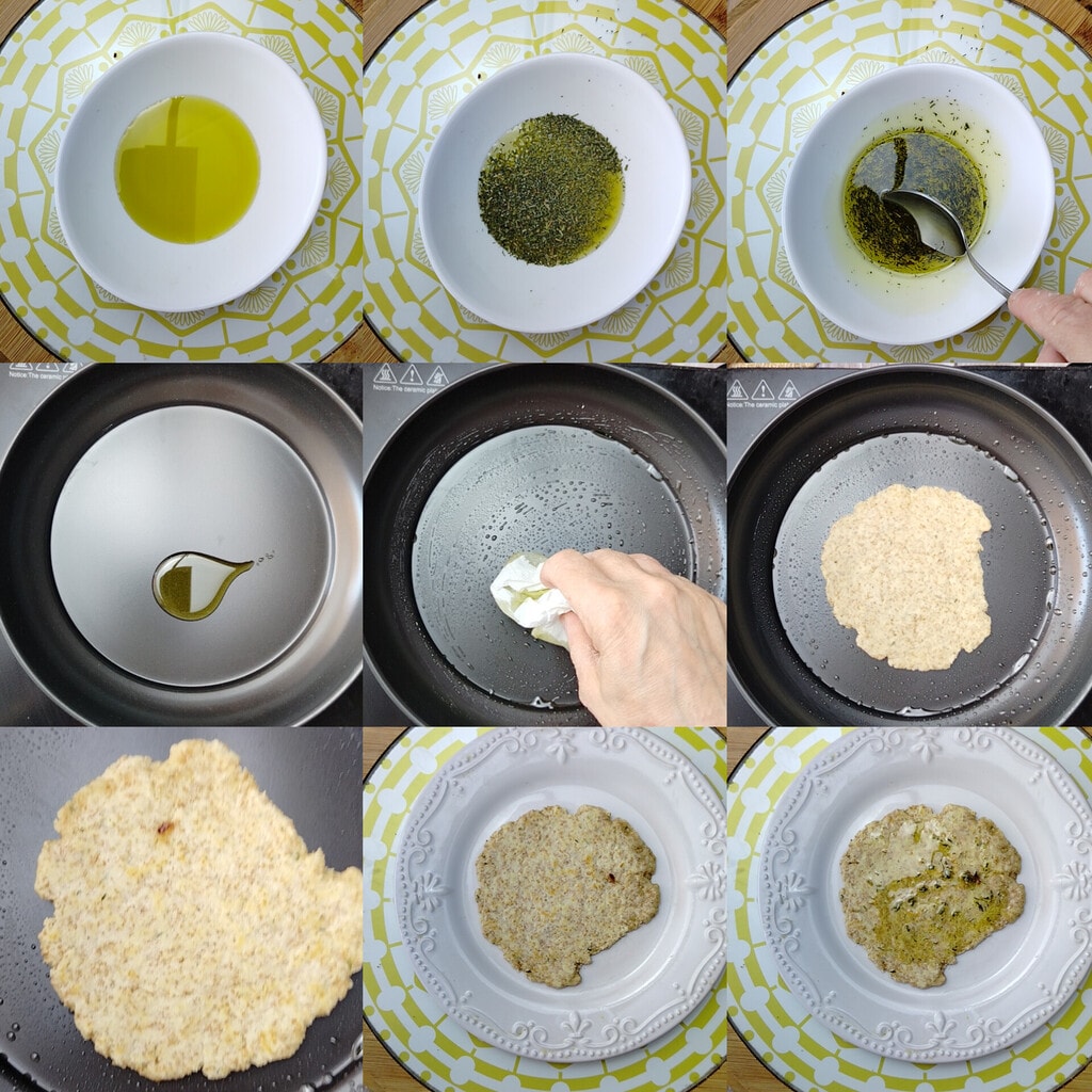 A fuego bajo cocina las mini tortitas 2-3 minutos por lado y cuando aún estén calientes adórnalas ligeramente en la superficie con una emulsión de aceite y cebollino previamente preparada.