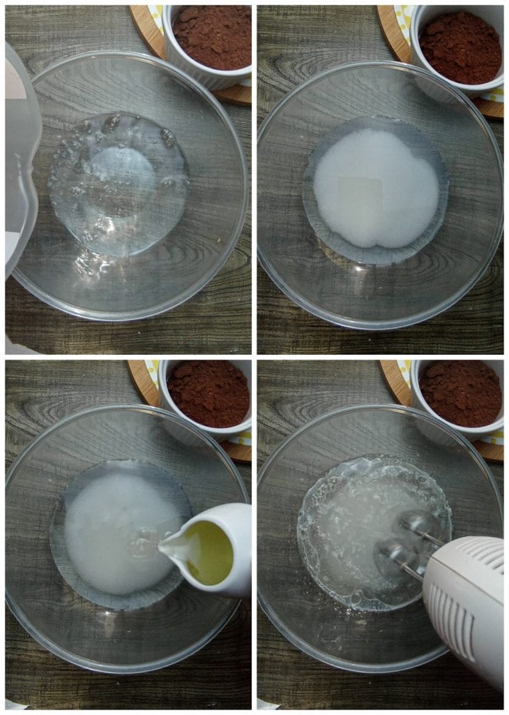 • Para hacer los Muffins de agua con cacao, primero, en un bol, une el azúcar con el agua, añade el aceite y mezcla, con la ayuda de las batidoras eléctricas, los primeros ingredientes.
