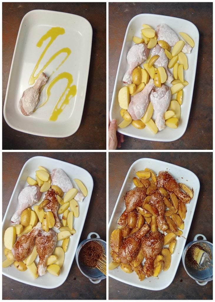 Pincelar la salsa sobre el pollo y las patatas, distribuyéndola bien y uniformemente.