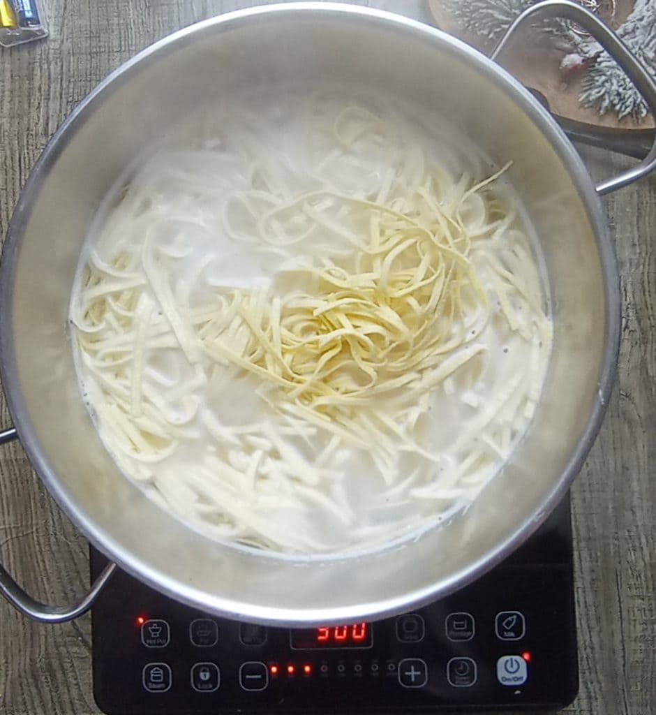 Dejamos cocinar durante 5 minutos y mientras tanto cocinamos la pasta en abundante agua con sal.