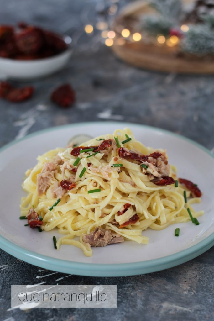 Pasta con atún de último minuto para la Nochebuena, con tomates secos y cebollino.