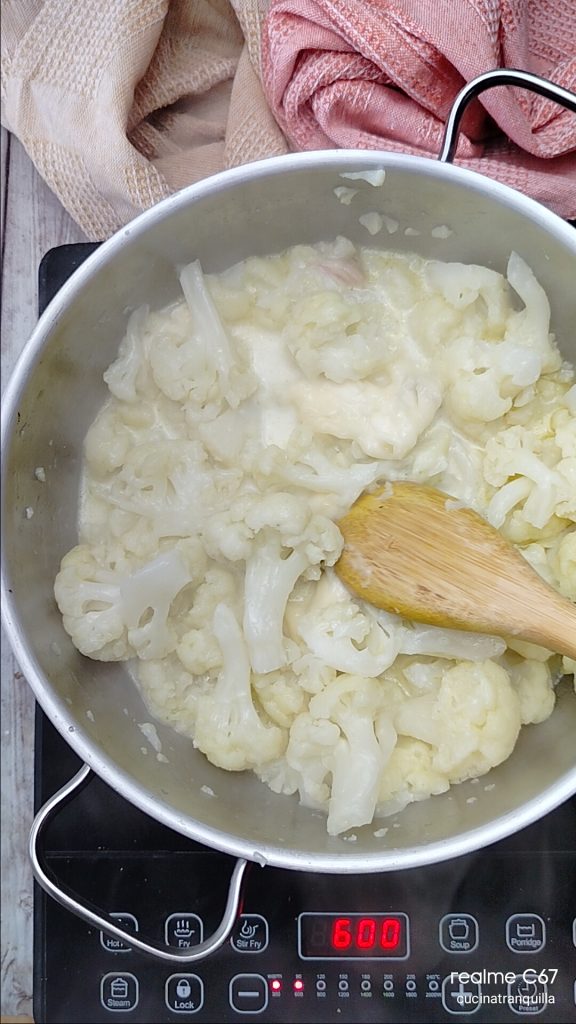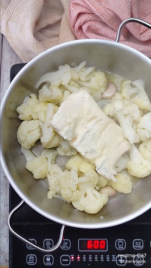 Quita la tapa y añade el gorgonzola a los coliflores.