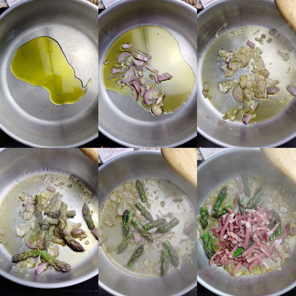 En una sartén amplia pochad la chalota en tres cucharadas de aceite. Cuando esté ligeramente dorada, añadid las puntas de los espárragos escaldadas y cocinad un par de minutos moviendo; añadid dos cucharones de agua caliente. Cuando ésta esté casi evaporada, incorporad el speck y cocinad dos minutos a fuego bajo.