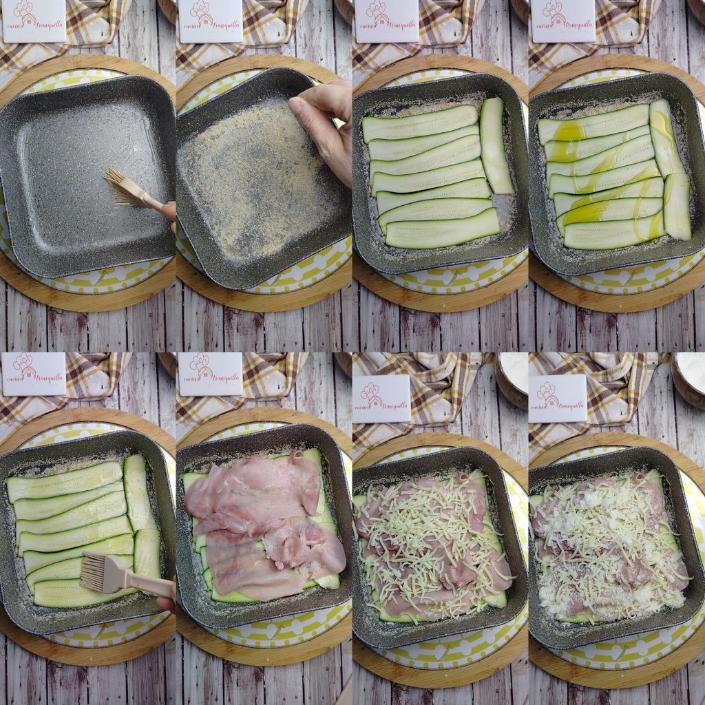 Unta ligeramente el fondo y los bordes de una fuente y espolvorea un poco de pan rallado para evitar que el pastel se pegue. Forma una primera capa superponiendo ligeramente los calabacines. Rocía con un poco de aceite y sazona con una pizca de sal; decora con dos lonchas de jamón cocido, aproximadamente un tercio de la mozzarella y alrededor de un tercio del Grana Padano rallado.