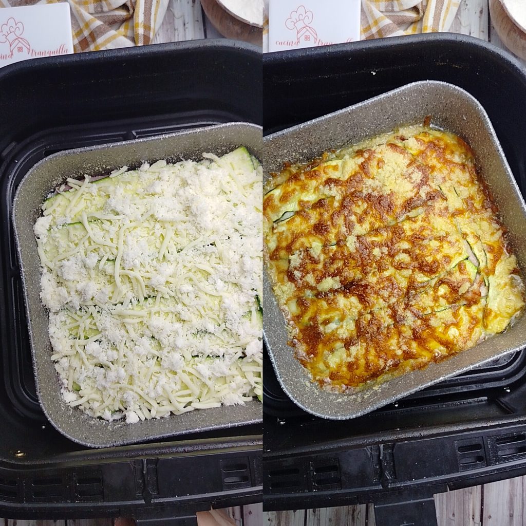 Puedes asar los calabacines rápidamente en una plancha, o pasarlos por la freidora de aire durante unos minutos. Obviamente los tiempos de cocción variarán, pero el resultado final del pastel será igualmente bueno.