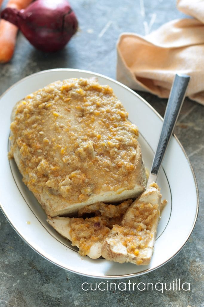 O puedes triturar todas las verduras utilizadas y llevar la pechuga a la mesa acompañándola con una salsa suave.