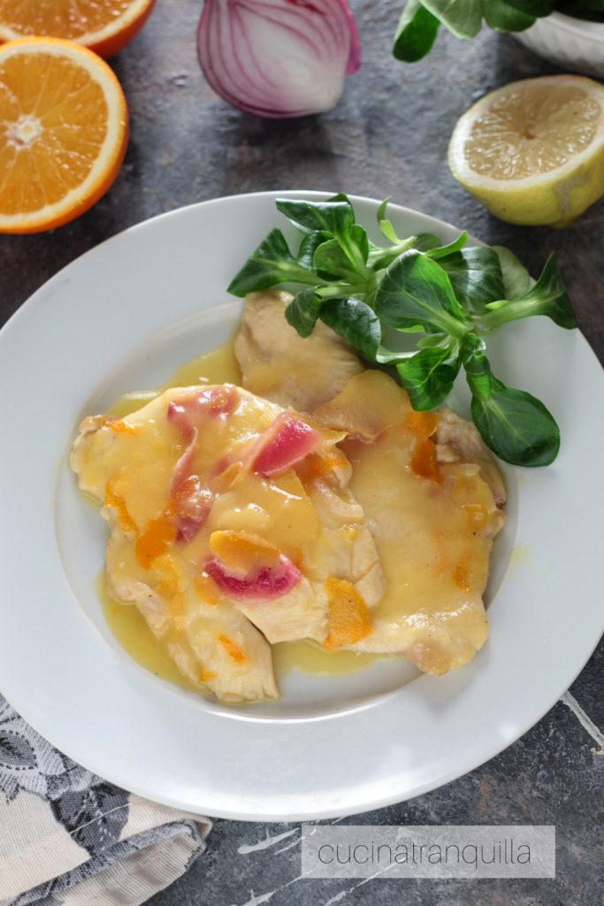 Pechuga de pollo a los cítricos, con cebolla roja, una receta rápida, fácil y buenísima.