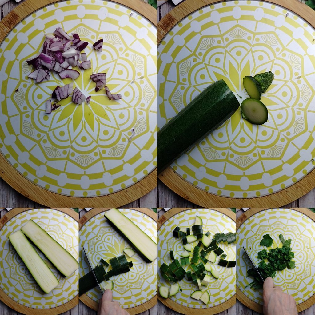 Para preparar las Penne con calabacines salteados, lo primero es cortar media cebolla, después de limpiarla de la piel y las raíces, en cubitos. Lava y seca los calabacines, quítales las puntas y córtalos también en cubitos. Pica el perejil tras lavarlo y secarlo, de forma bastante gruesa.