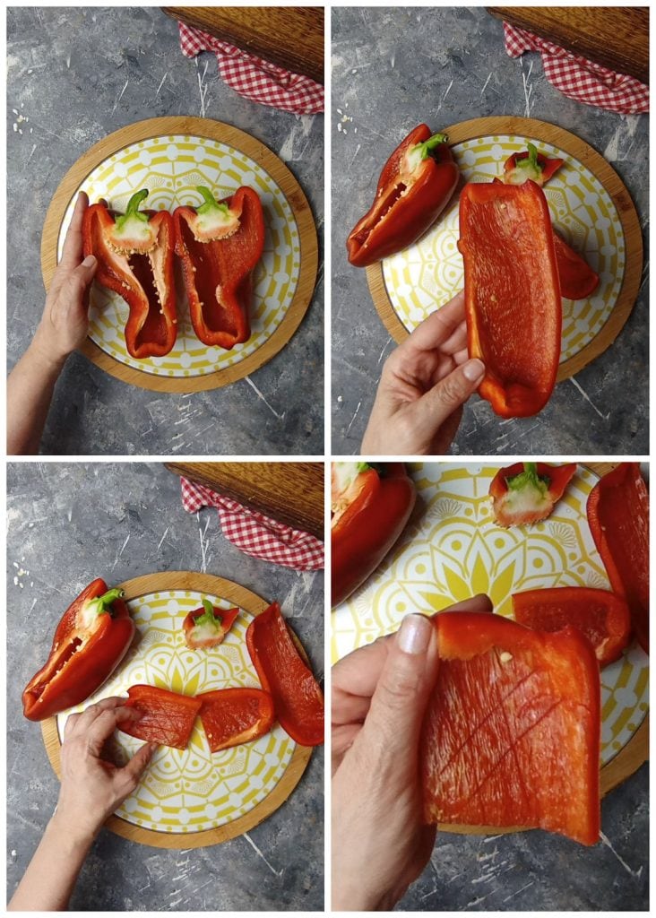 Estos pimientos, una vez cortados en forma de canoa, se llenan muy fácilmente, porque este corte permitirá que los ingredientes permanezcan en su interior.