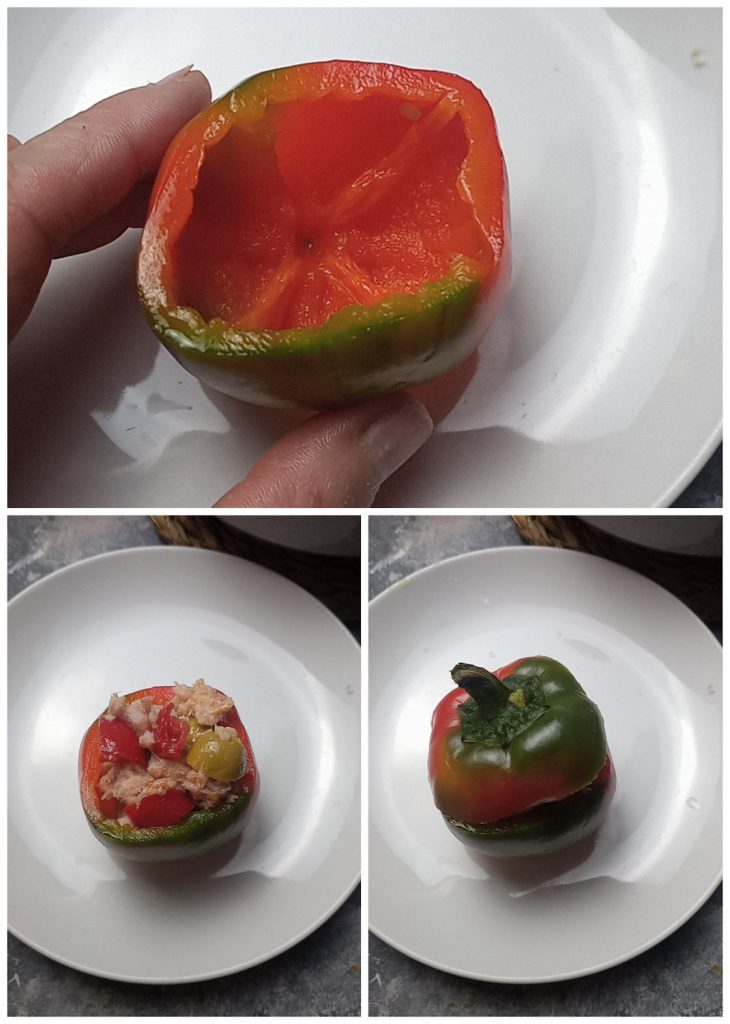 Solo será necesario escaldar los pimientos por unos minutos, dejarlos enfriar y luego rellenarlos al gusto.