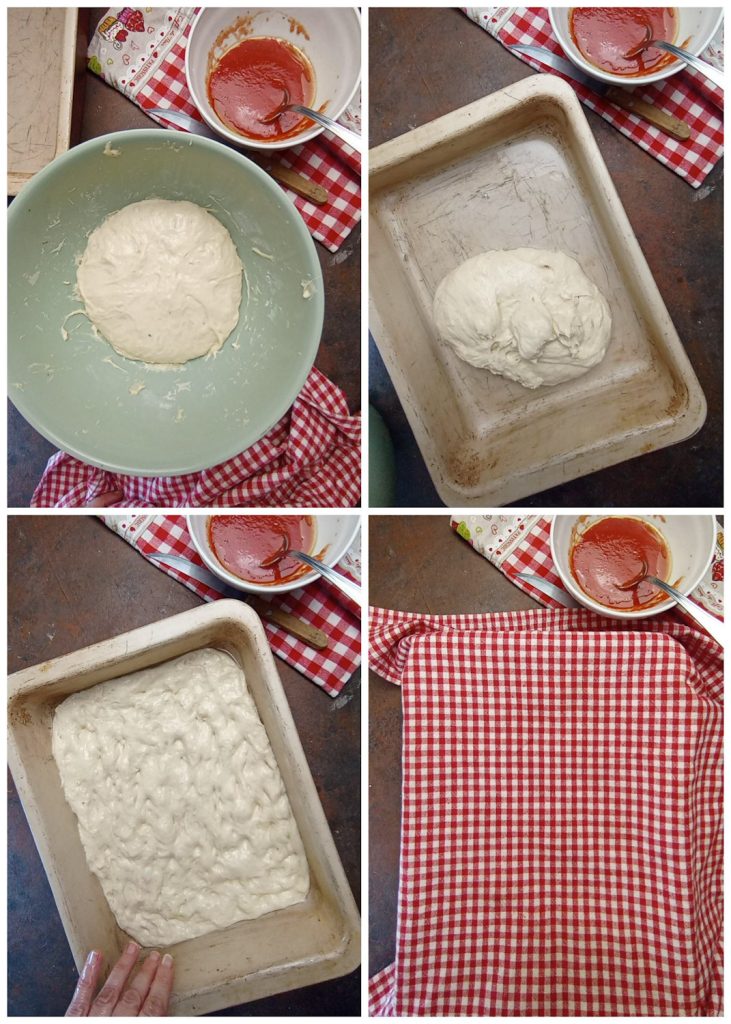La extendemos hasta los bordes ayudándonos con las manos ligeramente engrasadas, cubrimos y dejamos reposar 15 minutos.