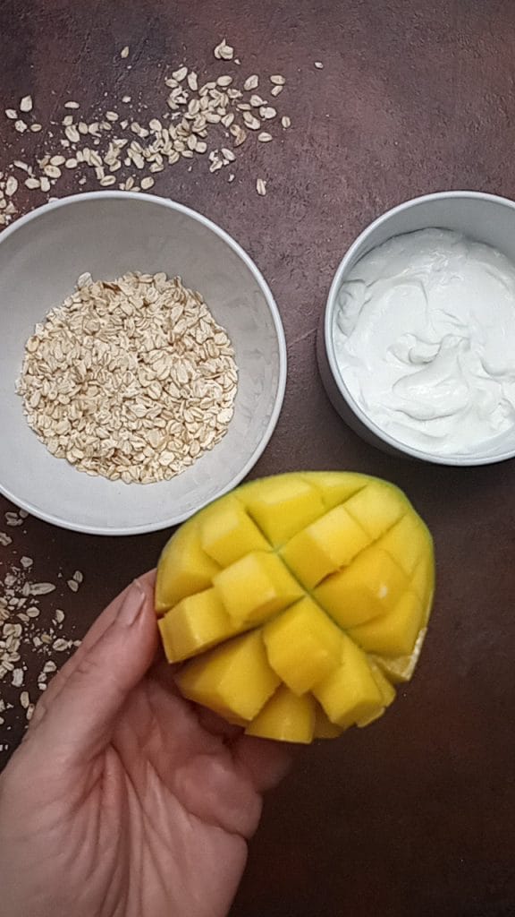 • Para preparar el Porridge overnight de mango sin cocción, primero limpiamos el mango eliminando el hueso central y cortándolo en cubos.