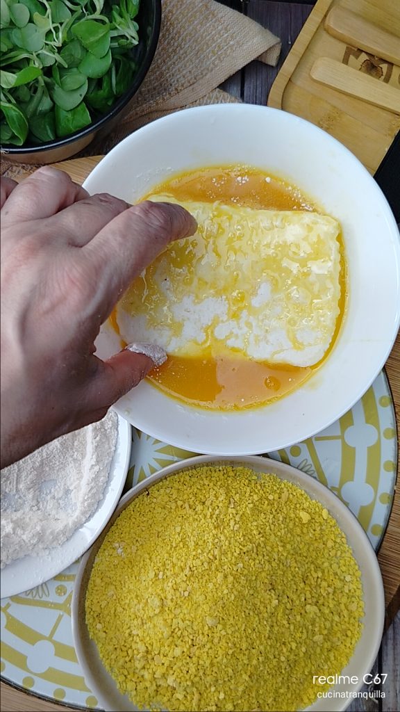 Ahora pasa la rodaja por la harina, presionando suavemente también en los bordes para un buen sellado del queso.