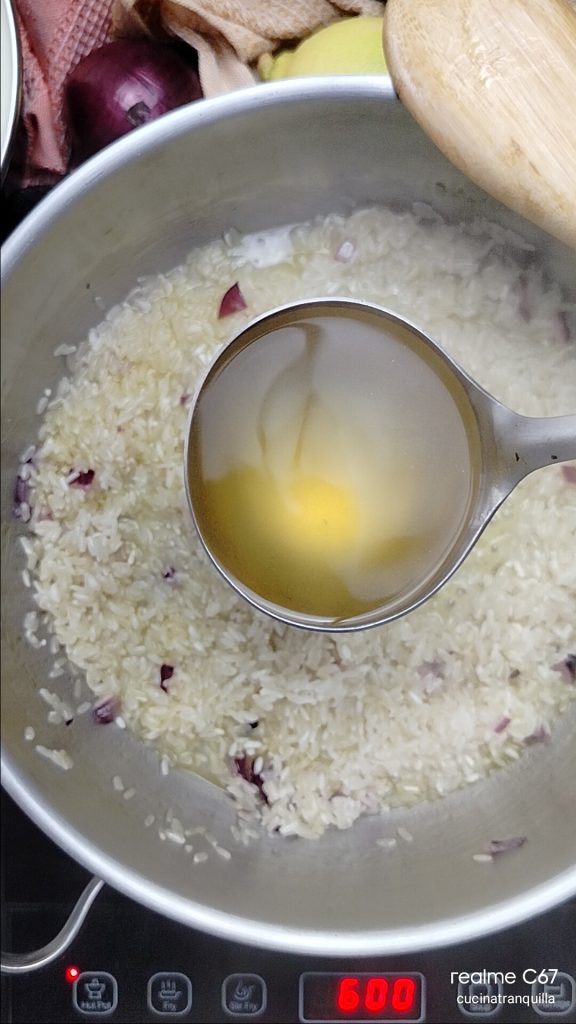 Cuando la parte alcohólica se haya evaporado, añadid un cucharón abundante de caldo muy caliente a la vez, añadiendo el siguiente cuando el anterior se haya absorbido. Esto para evitar que el arroz quede aguado.