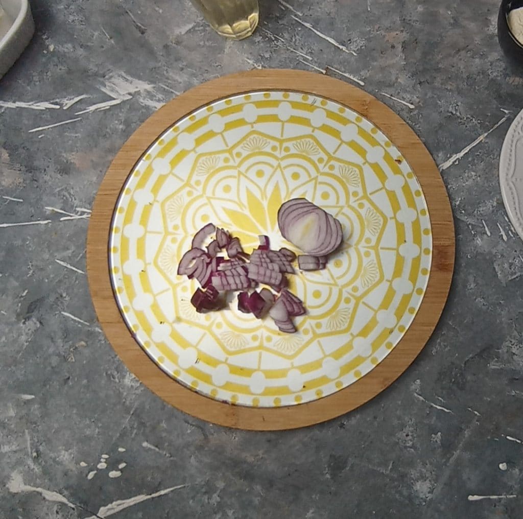• Pela la mitad de la cebolla y córtala en cubos muy pequeños.