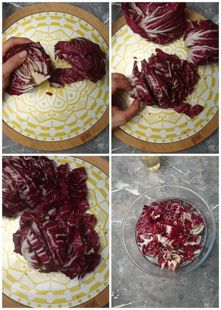 Corta cada mitad del radicchio en tiras finas y déjalas reposar 30 minutos en un bol con agua fría.